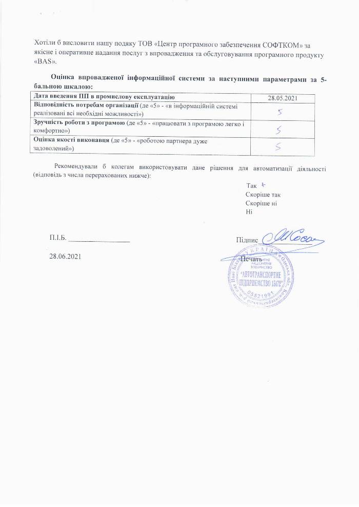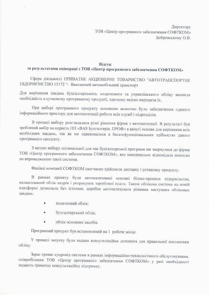 Хотіли б висловити нашу подяку ТОВ «Центр програмного забезпечення СОФТКОМ» за якісне і оперативне надання послуг з впровадження та обслуговування програмного продукту «BAS».