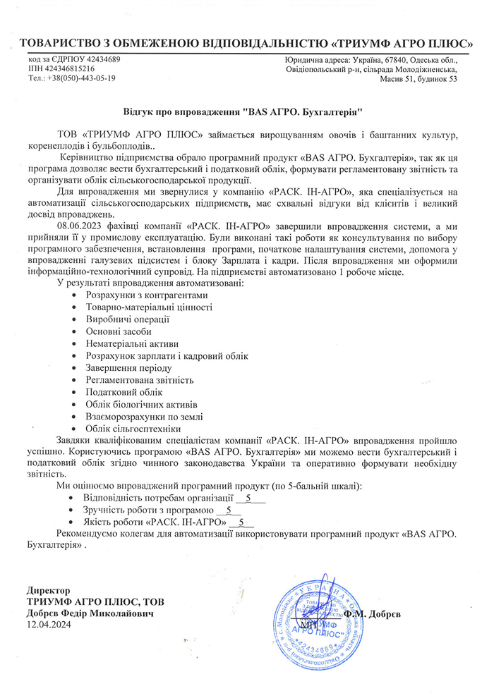 Завдяки кваліфікованим спеціалістам компанії «РАСК. ІН-АГРО» впровадження пройшло успішно. Користуючись програмою «BAS АГРО. Бухгалтерія» ми можемо вести бухгалтерський і податковий облік згідно чинного законодавства України та оперативно формувати необхідну звітність.
