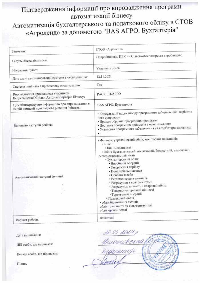 Автоматизація бухгалтерського та податкового обліку в СТОВ «Агроленд» за допомогою "BAS АГРО. Бухгалтерія"