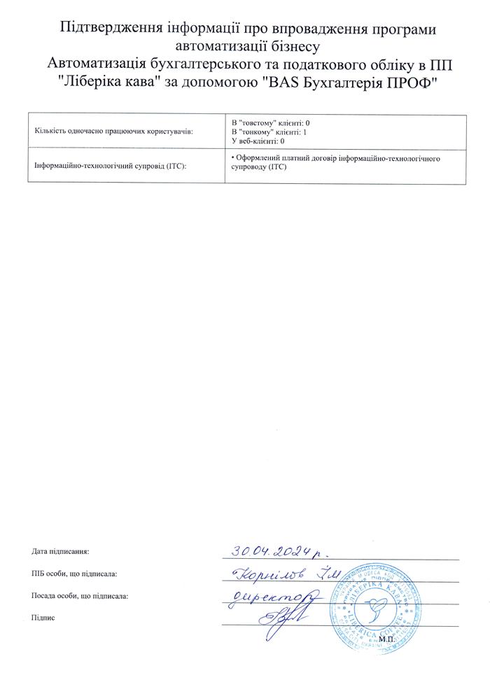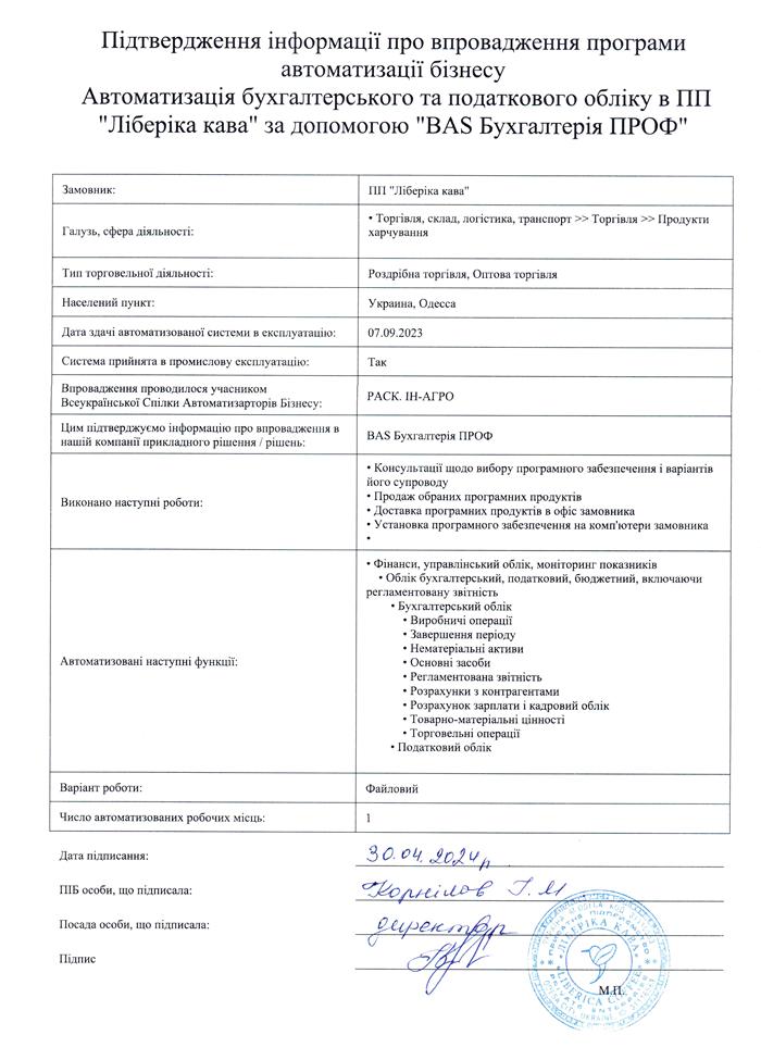 Автоматизація бухгалтерського та податкового обліку в ПП "Ліберіка кава" за допомогою "BAS Бухгалтерія ПРОФ"