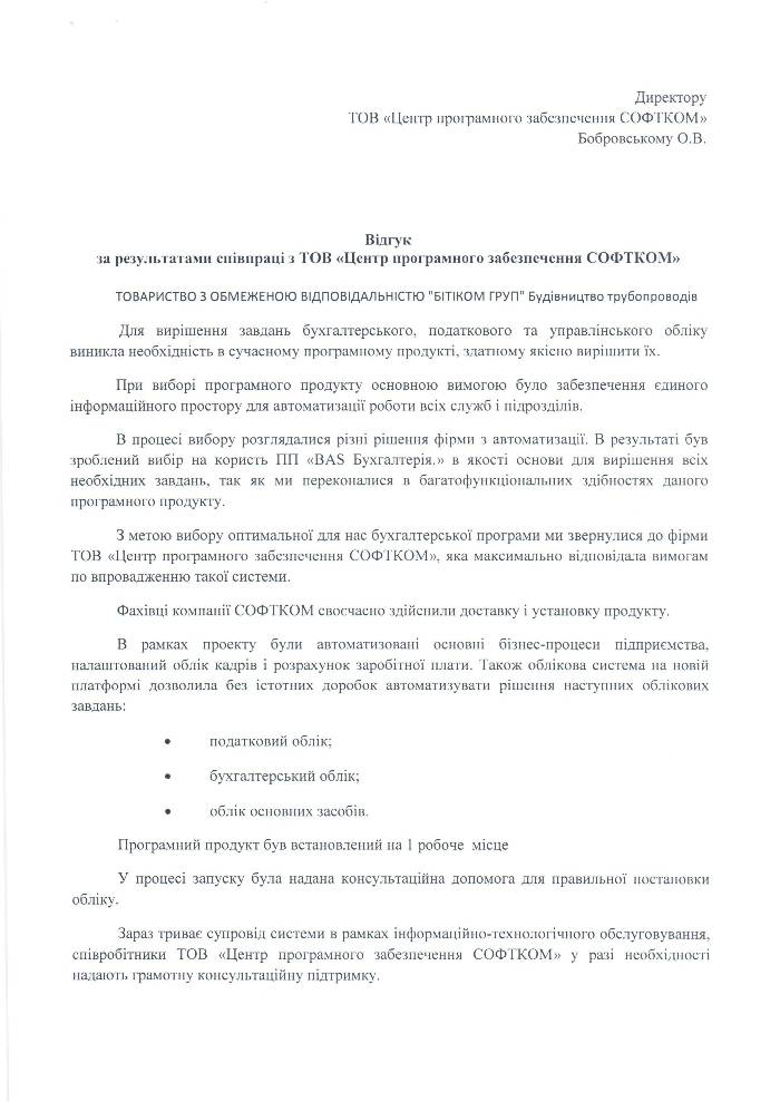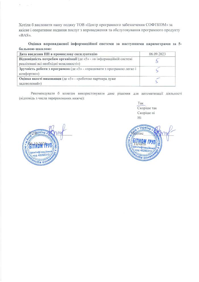 Хотіли б висловити нашу подяку ТОВ «Центр програмного забезпечення СОФТКОМ» за якісне і оперативне надання послуг з впровадження та обслуговування програмного продукту «BAS».