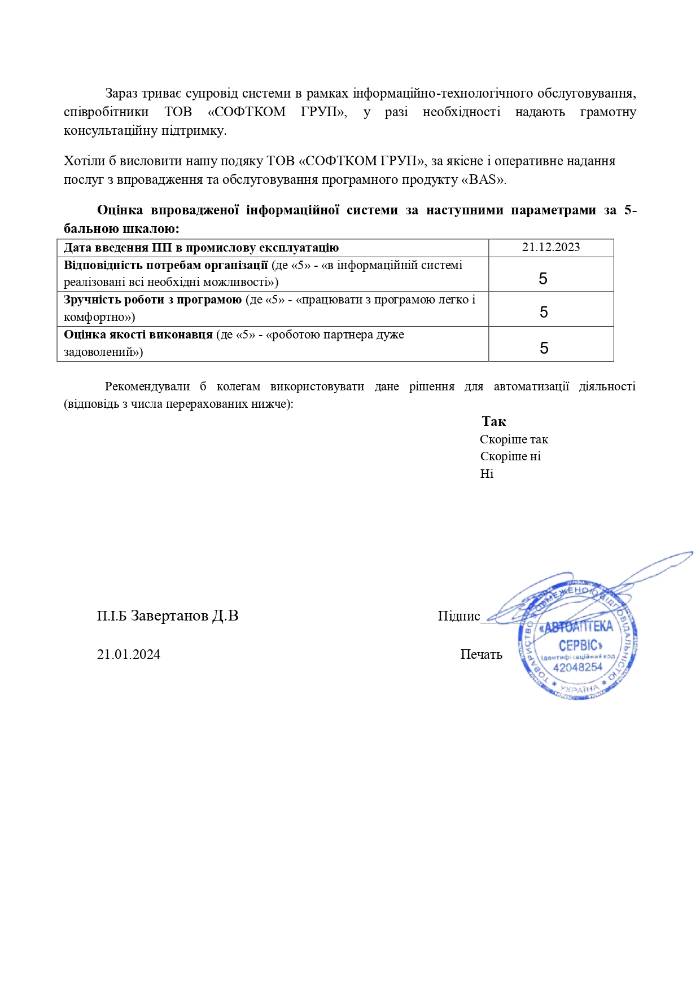 Хотіли б висловити нашу подяку ТОВ «СОФТКОМ ГРУП», за якісне і оперативне надання послуг з впровадження та обслуговування програмного продукту «BAS».