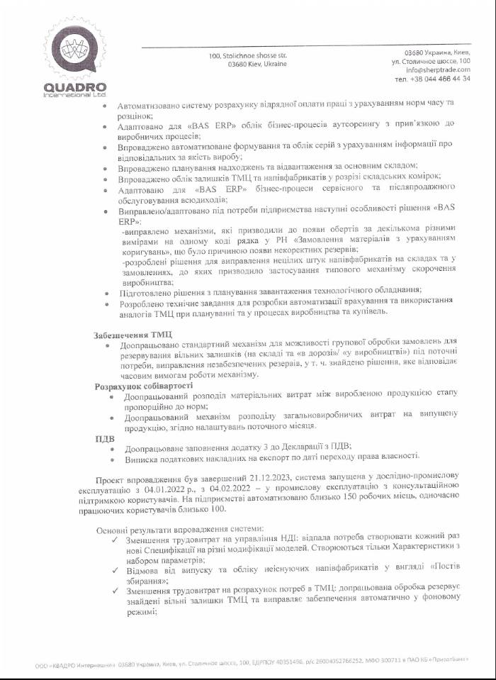 Керівництво «КВАДРО ІНТЕРНЕШНЛ» дякує колективу компанії «REARDEN GROUP (EBS)» за впровадження та підтримку системи, а також за підготовку персоналу підприємства до роботи в програмному комплексі.