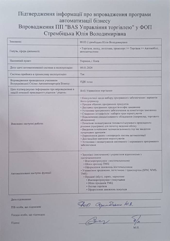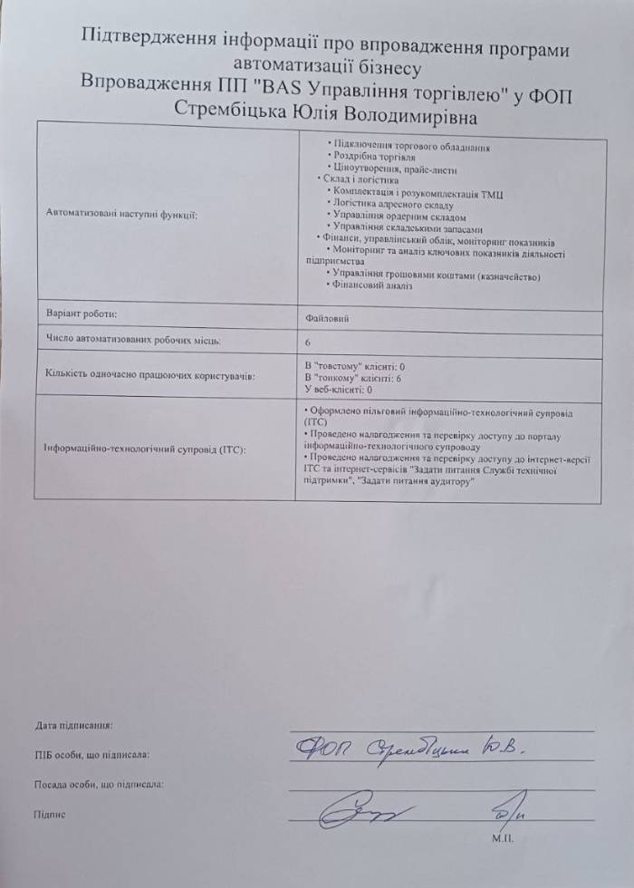 Впровадження ПП "BAS Управління торгівлею" у ФОП Стрембіцька Юлія Володимирівна
