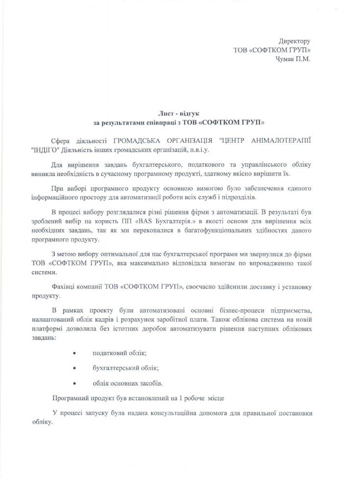 Комплексна автоматизація бухгалтерського та податкового обліку ГО "Центр анімалотерапії "Індіго"" на базі ПП "BAS Бухгалтерія ПРОФ"