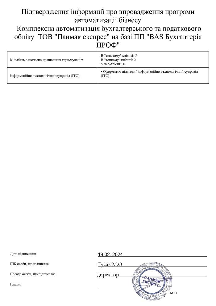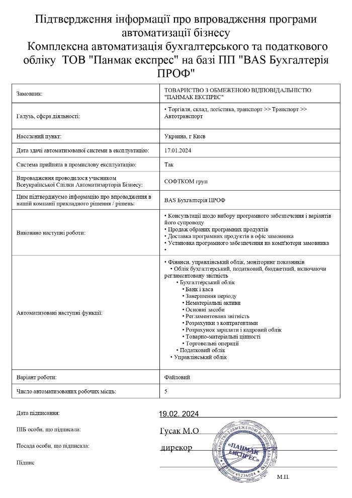 Комплексна автоматизація бухгалтерського та податкового обліку ТОВ "Панмак експрес" на базі ПП "BAS Бухгалтерія ПРОФ"