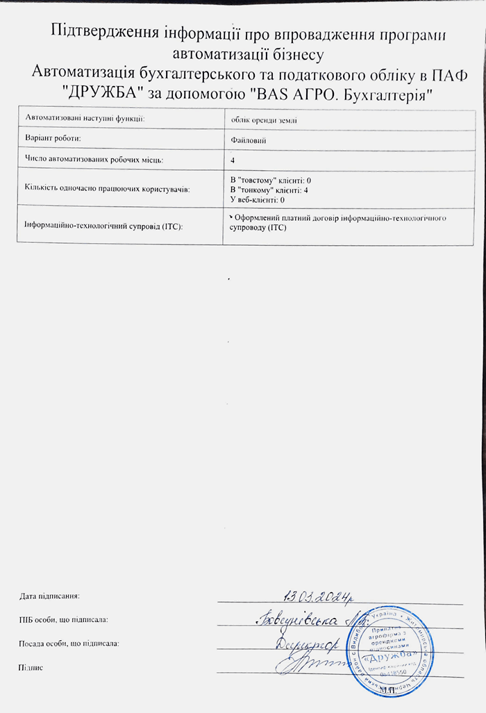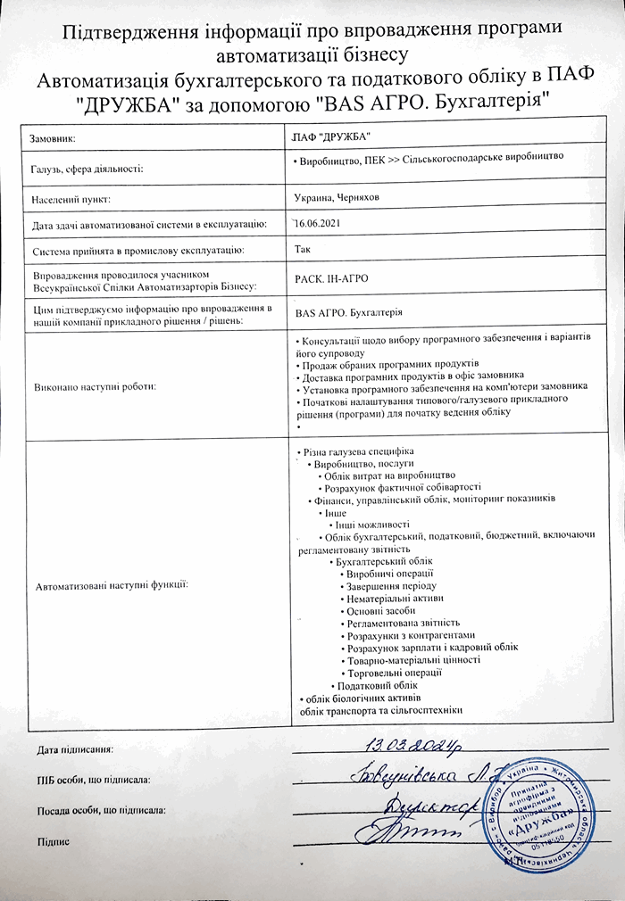 Автоматизація бухгалтерського та податкового обліку в ПАФ "ДРУЖБА" за допомогою "BAS АГРО. Бухгалтерія"