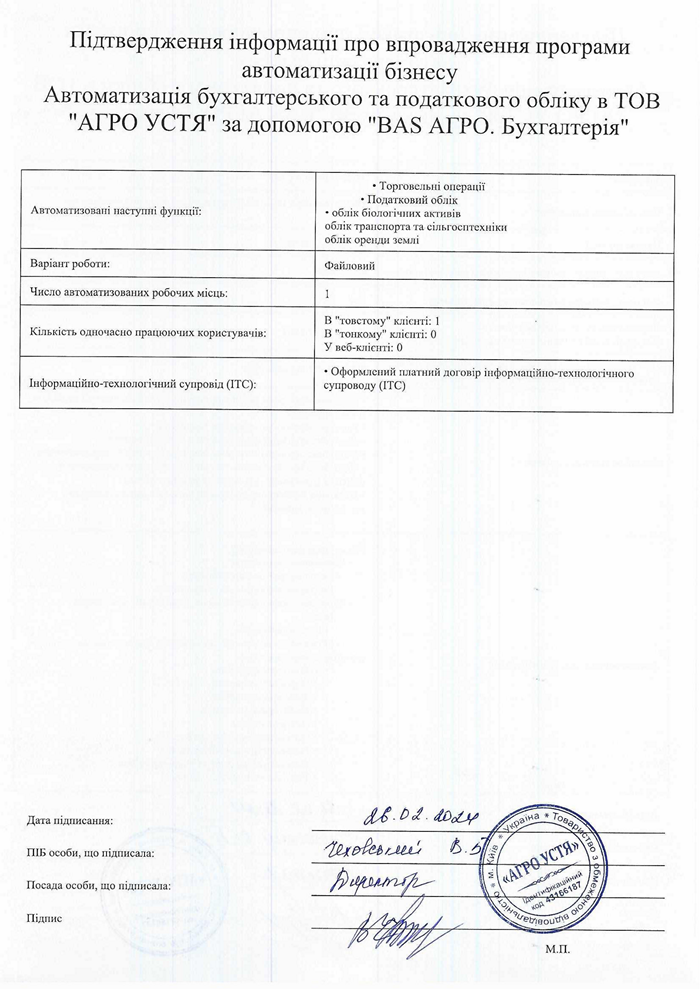 Автоматизація бухгалтерського та податкового обліку в ТОВ "АГРО УСТЯ" за допомогою "BAS АГРО. Бухгалтерія"