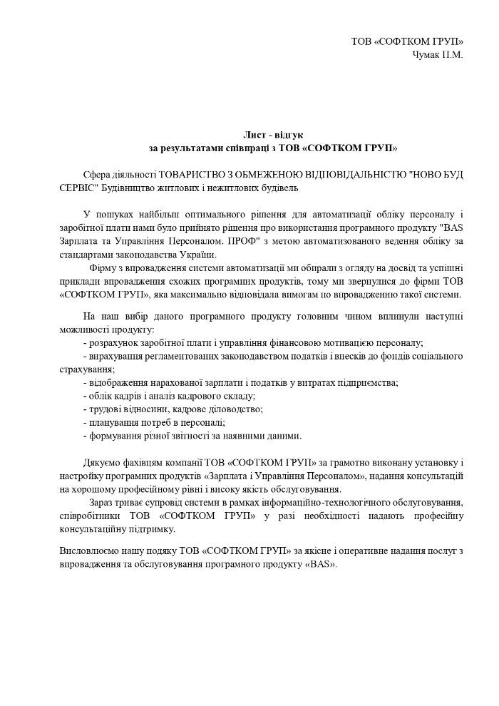Висловлюємо нашу подяку ТОВ «СОФТКОМ ГРУП» за якісне і оперативне надання послуг з впровадження та обслуговування програмного продукту «BAS».