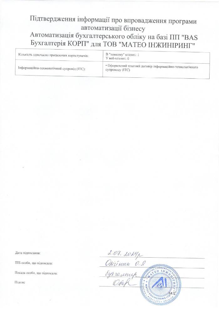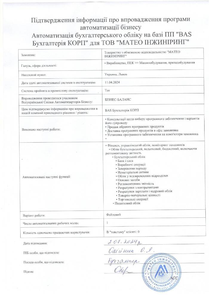 Автоматизація бухгалтерського обліку на базі ПП "BAS Бухгалтерія КОРП" для ТОВ "МАТЕО ІНЖИНІРИНГ"