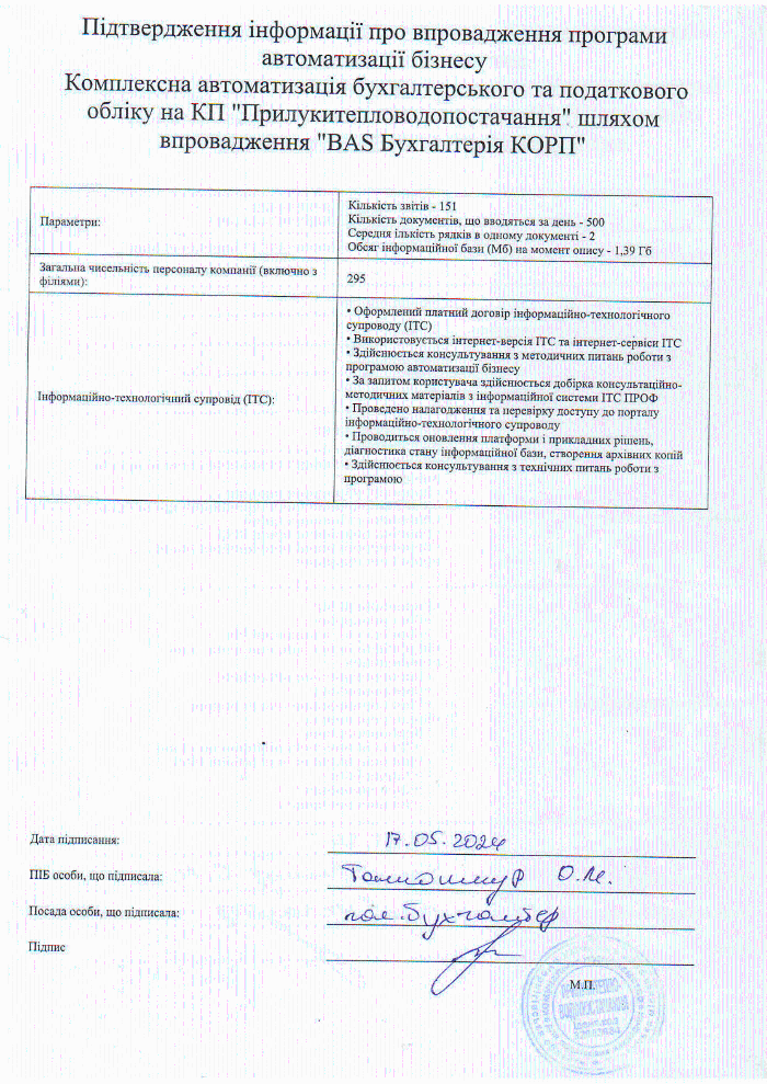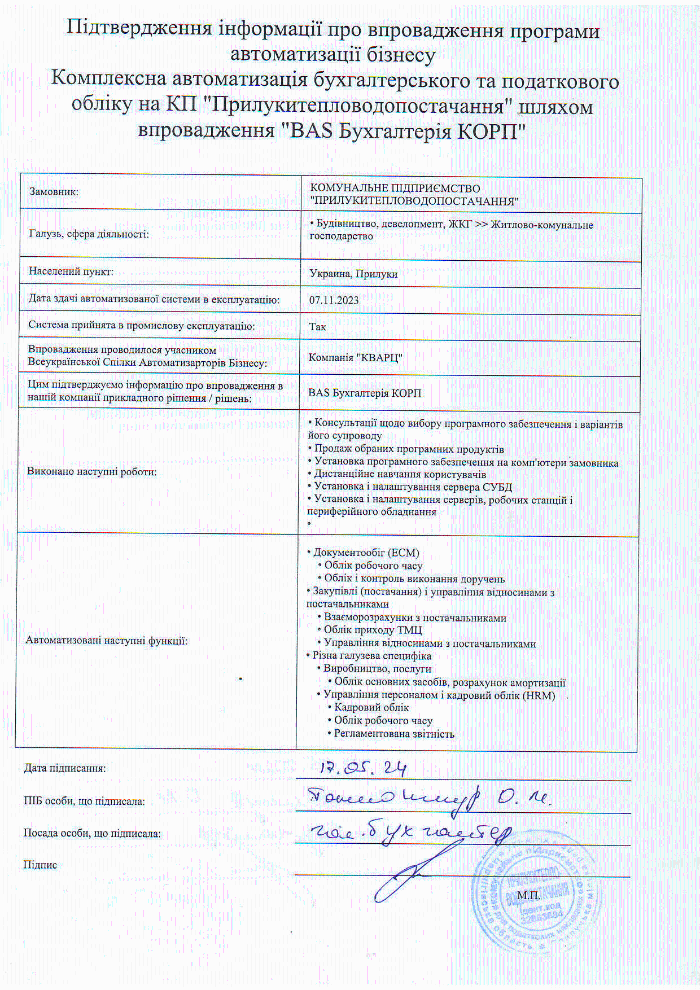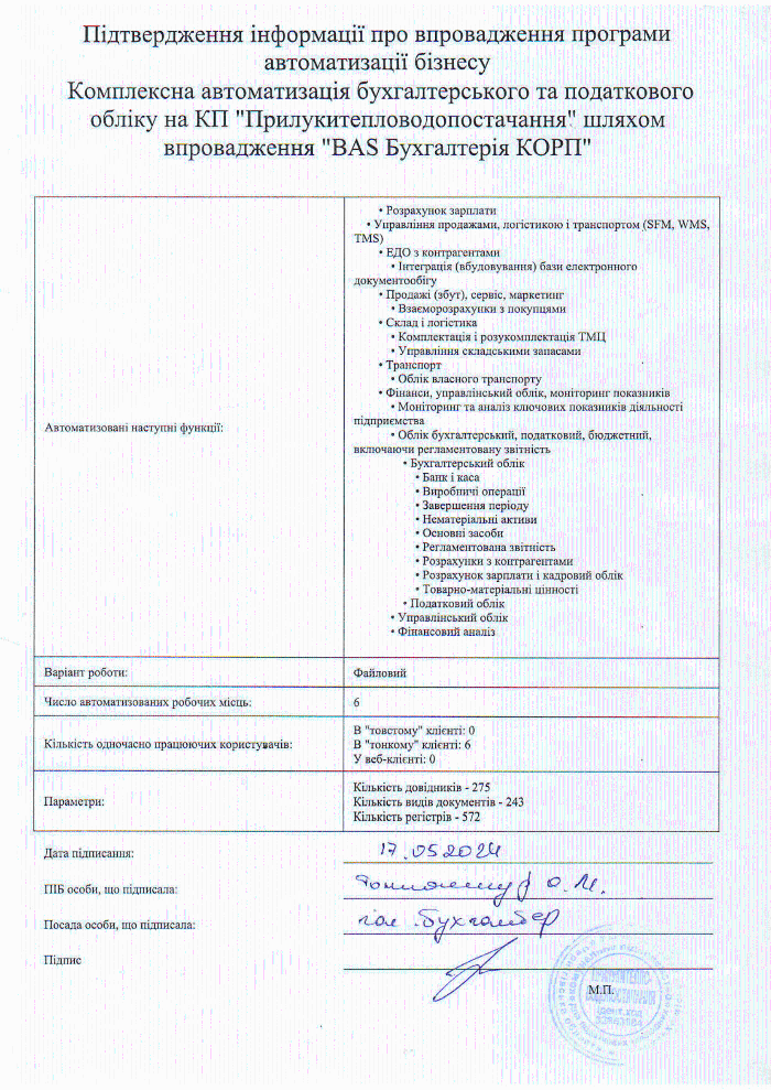 Комплексна автоматизація бухгалтерського та податкового обліку на КП "Прилукитепловодопостачання" шляхом впровадження "BAS Бухгалтерія КОРП"