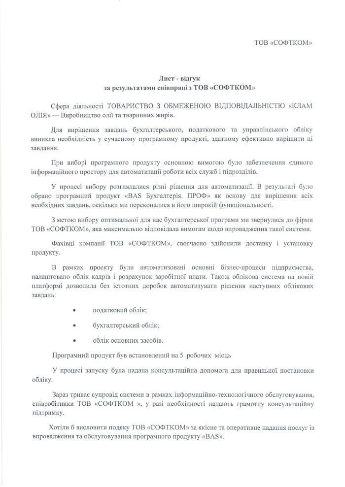 Хотіли б висловити подяку ТОВ «СОФТКОМ» за якісне та оперативне надання послуг із впровадження та обслуговування програмного продукту «BAS».