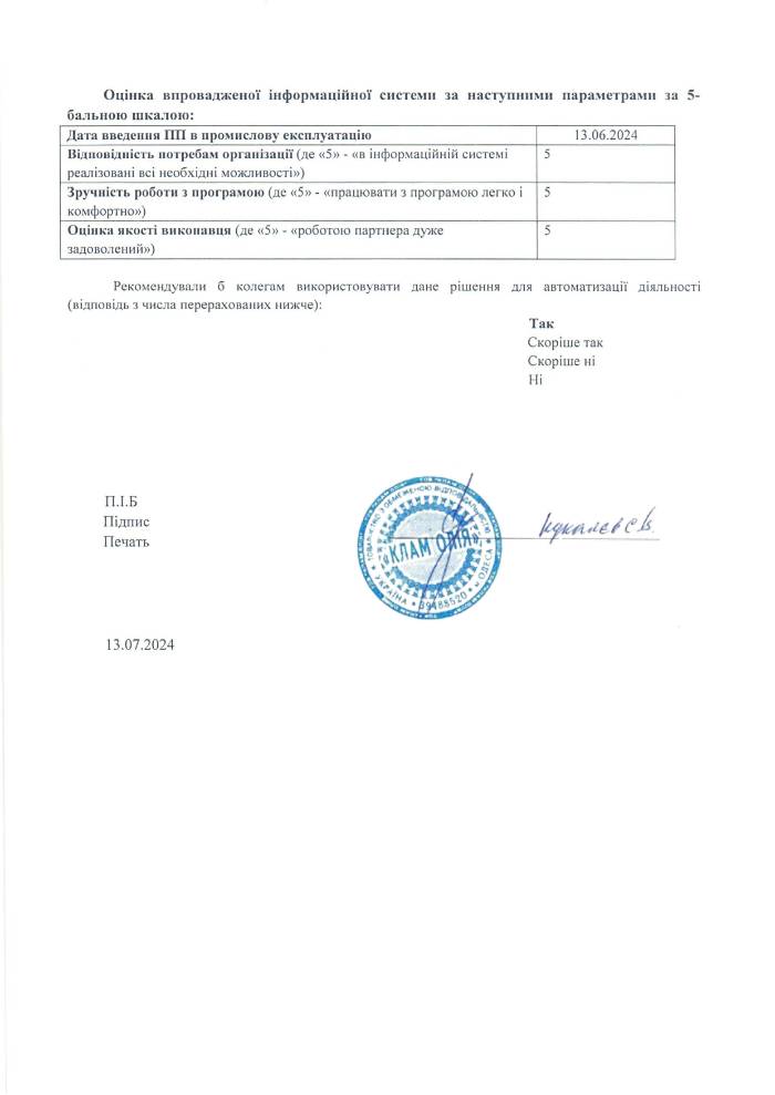 Оцінка впровадженої інформаційної системи за наступними параметрами за 5-бальною шкалою: