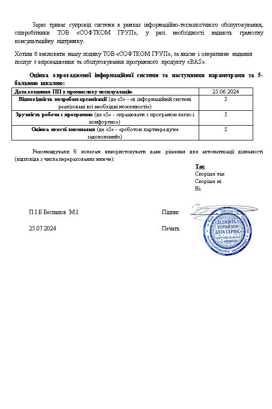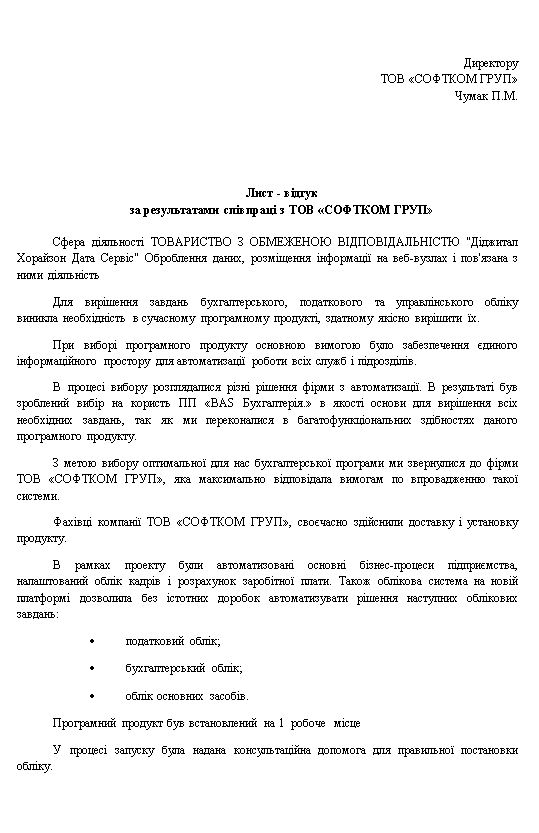 Хотіли б висловити нашу подяку ТОВ «СОФТКОМ ГРУП», за якісне і оперативне надання послуг з впровадження та обслуговування програмного продукту «BAS».