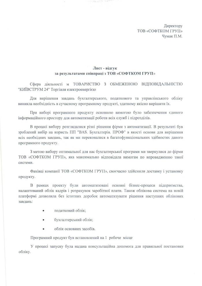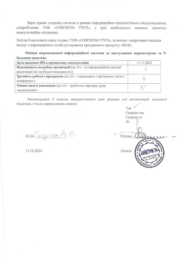 Хотіли б висловити подяку ТОВ «СОФТКОМ ГРУП» за якісне та оперативне надання послуг із впровадження та обслуговування програмного продукту «BAS».