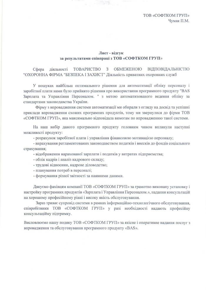 Висловлюємо нашу подяку ТОВ «СОФТКОМ ГРУП» за якісне і оперативне надання послуг з впровадження та обслуговування програмного продукту «BAS».