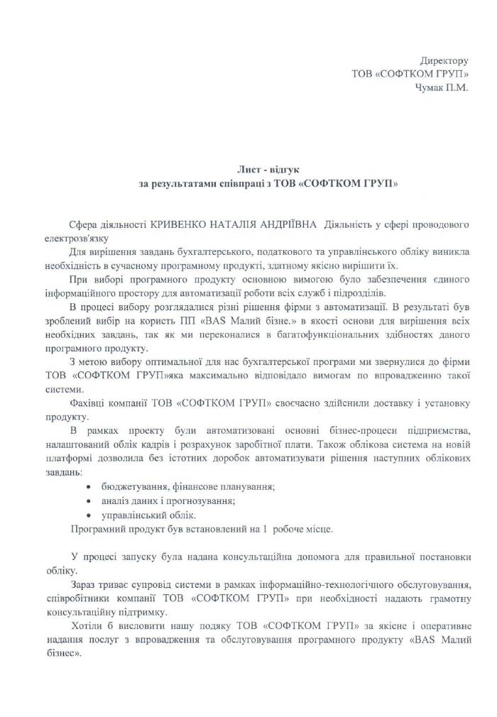 Хотіли б висловити нашу подяку ТОВ «СОФТКОМ ГРУП» за якісне і оперативне надання послуг з впровадження та обслуговування програмного продукту «BAS Малий бізнес».