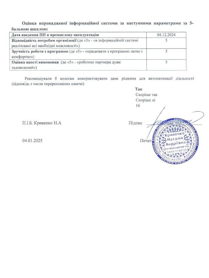 Оцінка впровадженої інформаційної системи за наступними параметрами за 5-бальною шкалою: