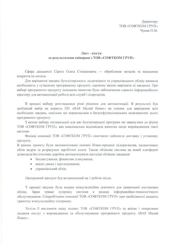 Хотіли б висловити нашу подяку ТОВ «СОФТКОМ ГРУП» за якісне і оперативне надання послуг з впровадження та обслуговування програмного продукту «BAS Малий бізнес».