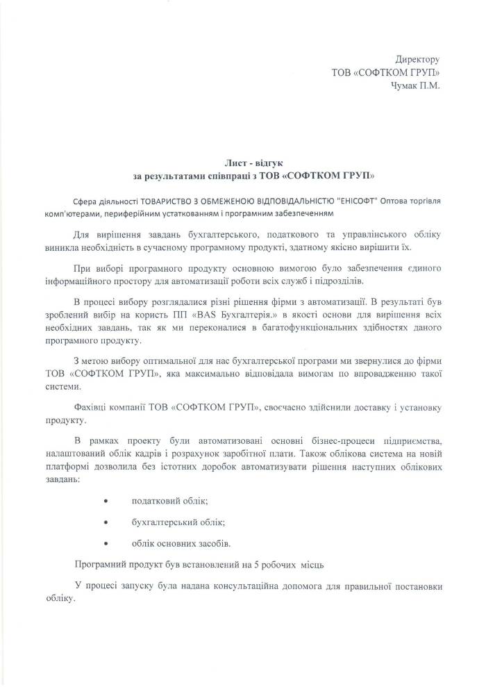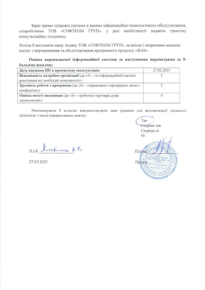 Хотіли б висловити нашу подяку ТОВ «СОФТКОМ ГРУП», за якісне і оперативне надання послуг з впровадження та обслуговування програмного продукту «BAS».