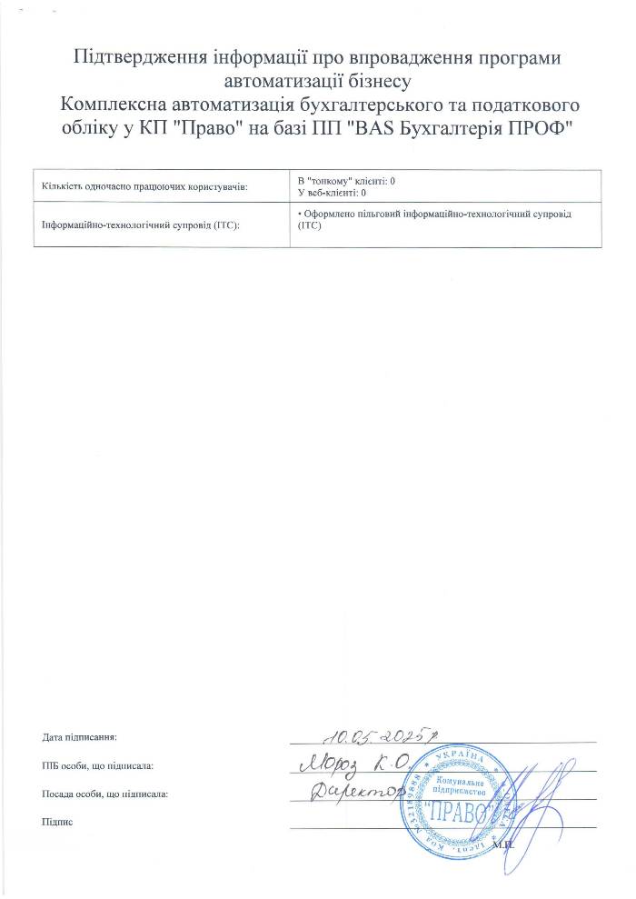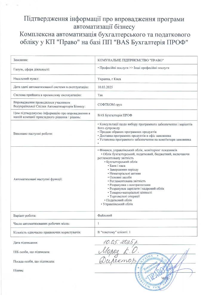 Комплексна автоматизація бухгалтерського та податкового обліку у КП "Право" на базі ПП "BAS Бухгалтерія ПРОФ"