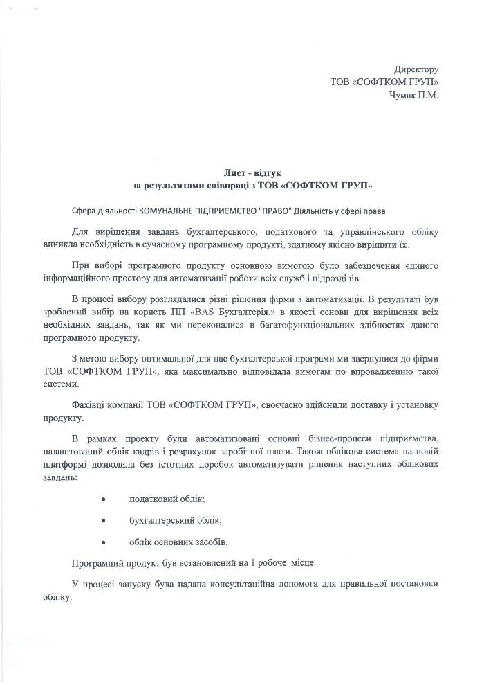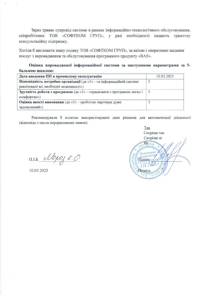 Хотіли б висловити нашу подяку ТОВ «СОФТКОМ ГРУП», за якісне і оперативне надання послуг з впровадження та обслуговування програмного продукту «BAS».