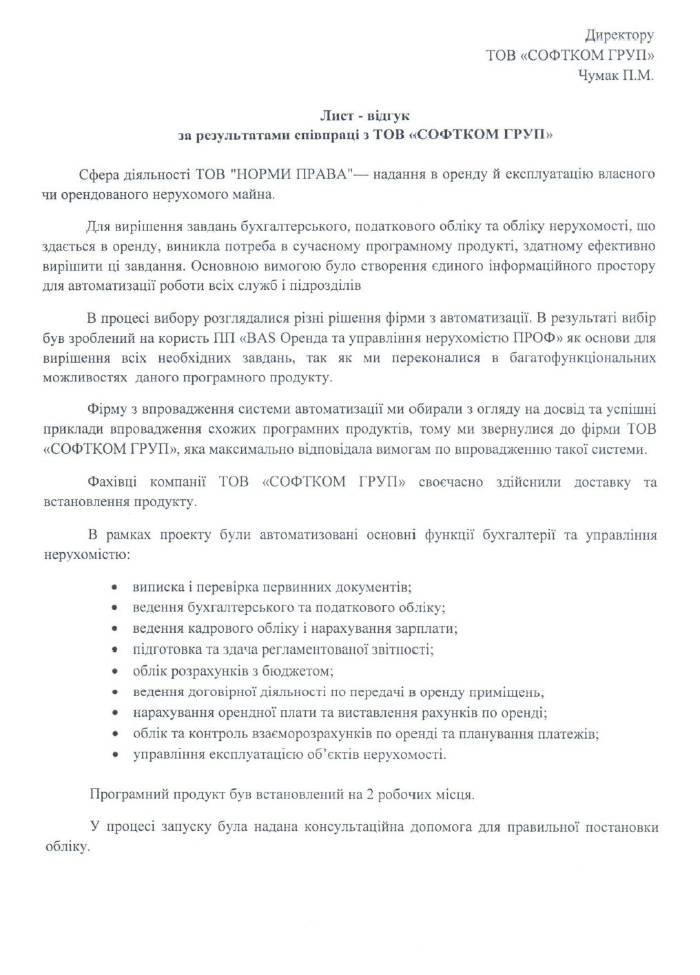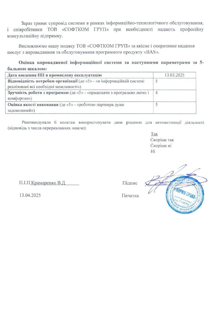 Висловлюємо нашу подяку ТОВ «СОФТКОМ ГРУП» за якісне і оперативне надання послуг з впровадження та обслуговування програмного продукту «BAS».