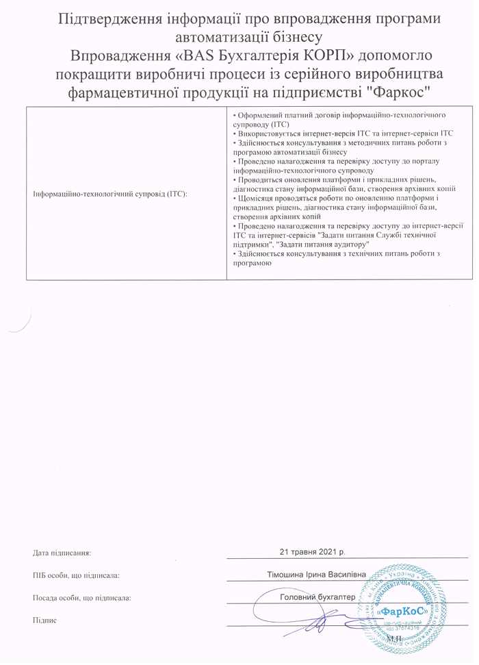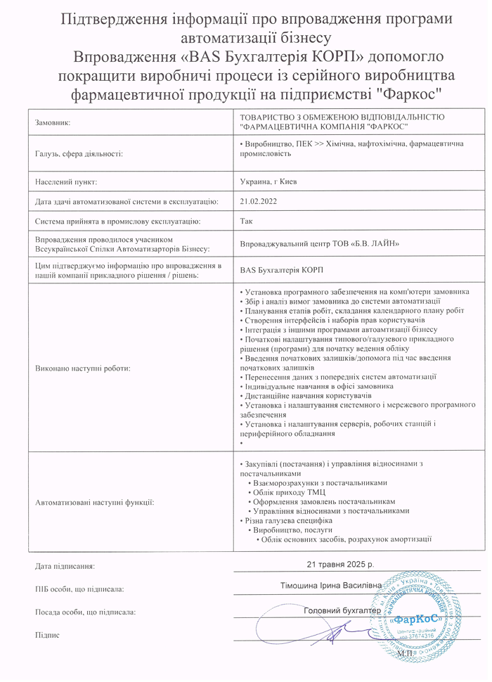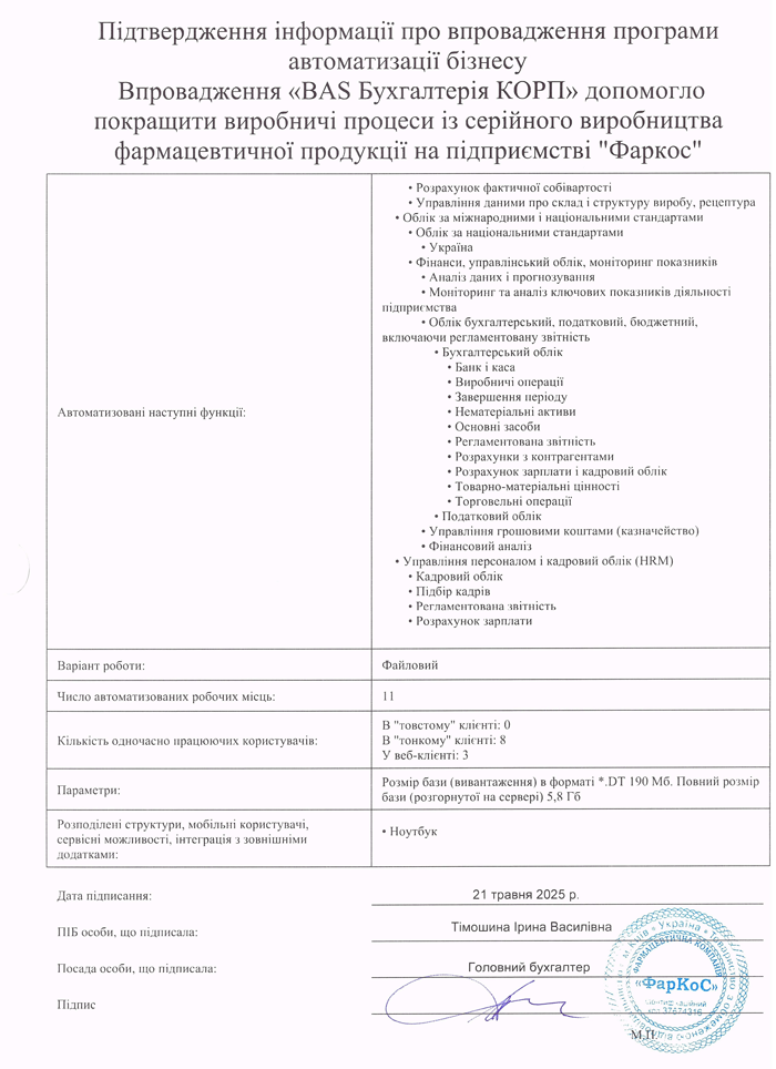 Впровадження «BAS Бухгалтерія КОРП» допомогло покращити виробничі процеси із серійного виробництва фармацевтичної продукції на підприємстві "Фаркос"