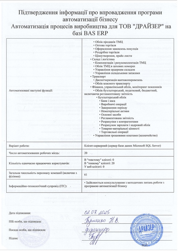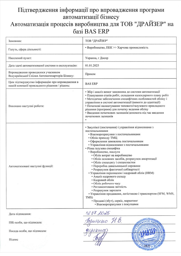 Автоматизація процесів виробництва для ТОВ "ДРАЙЗЕР" на базі BAS ERP