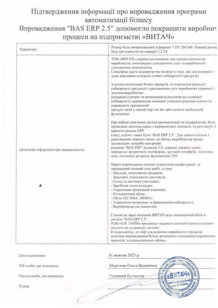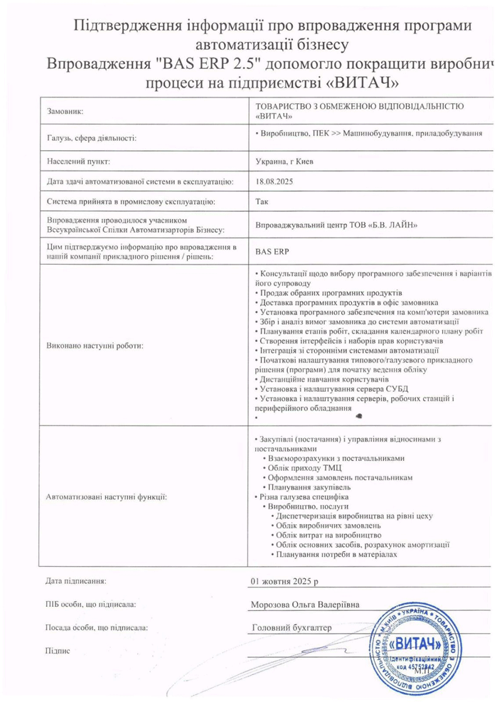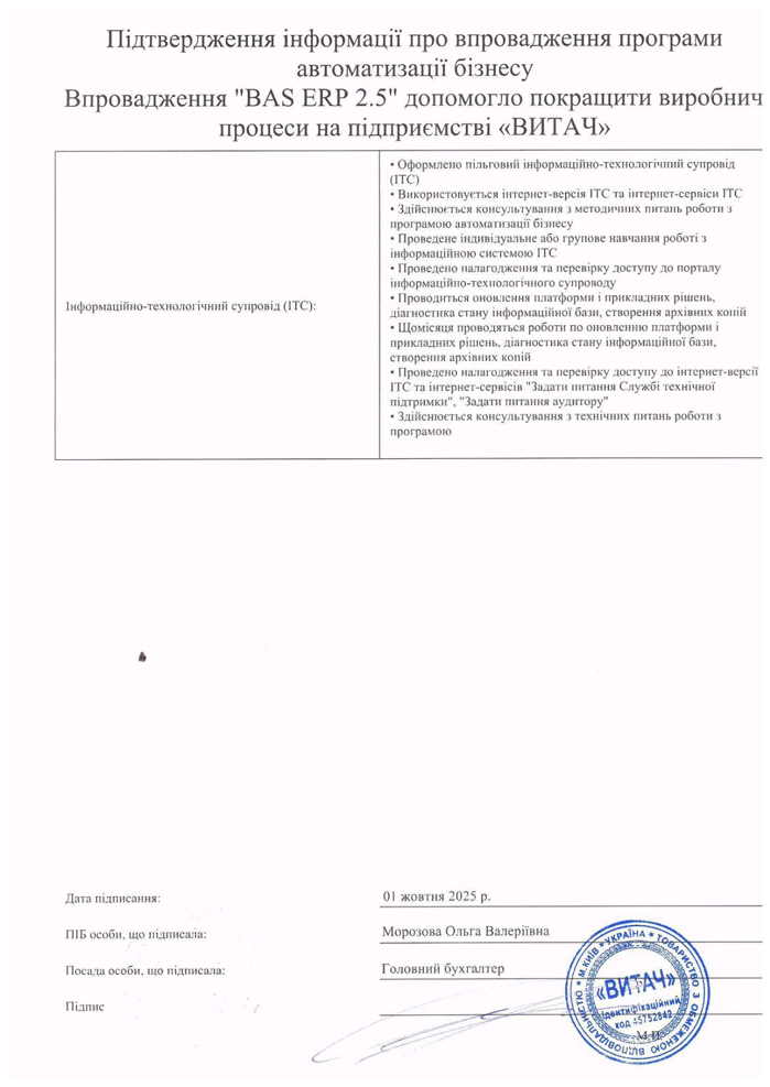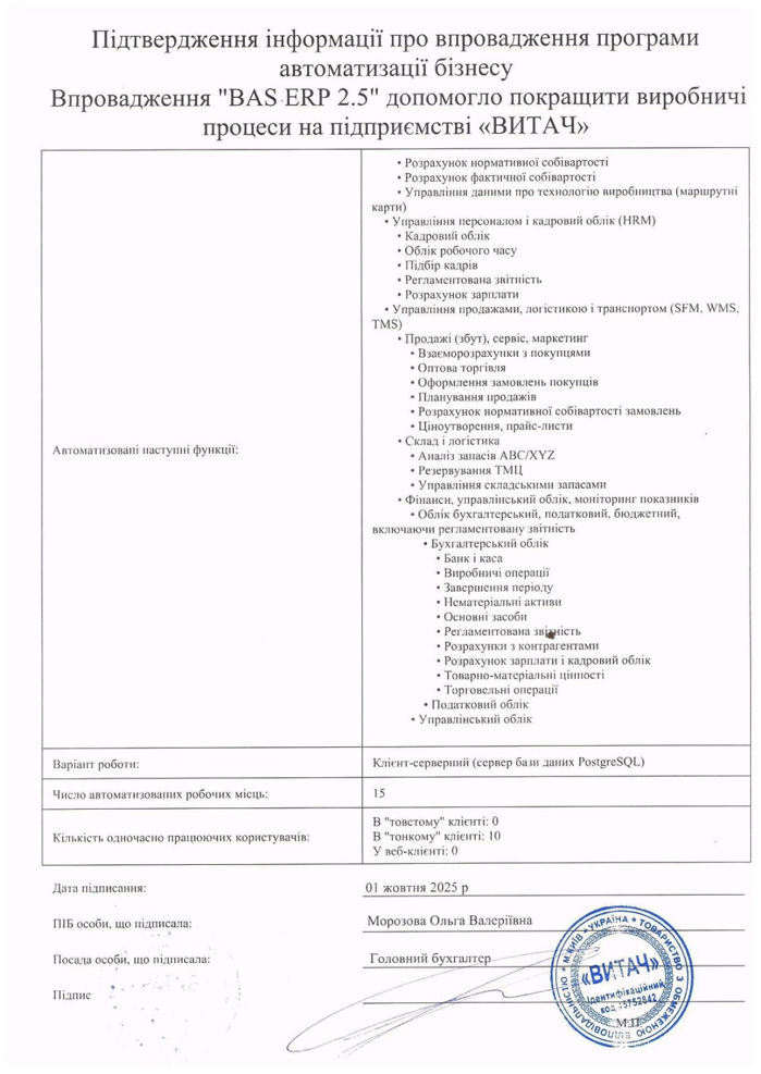 Впровадження "BAS ERP 2.5" допомогло покращити виробничі процеси на підприємстві «ВИТАЧ»