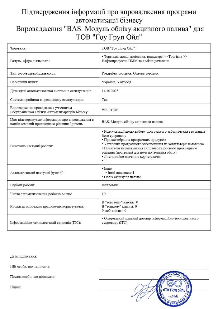 Впровадження "BAS. Модуль обліку акцизного палива" для ТОВ "Гоу Груп Ойл"