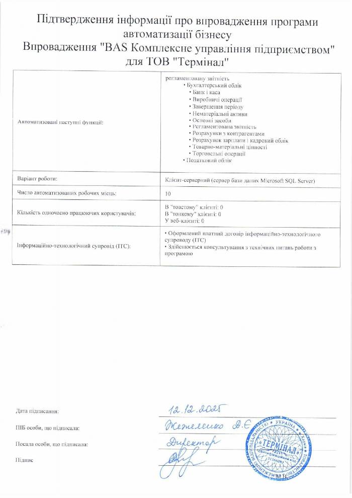 Впровадження "BAS Комплексне управління підприємством" для ТОВ "Термінал"