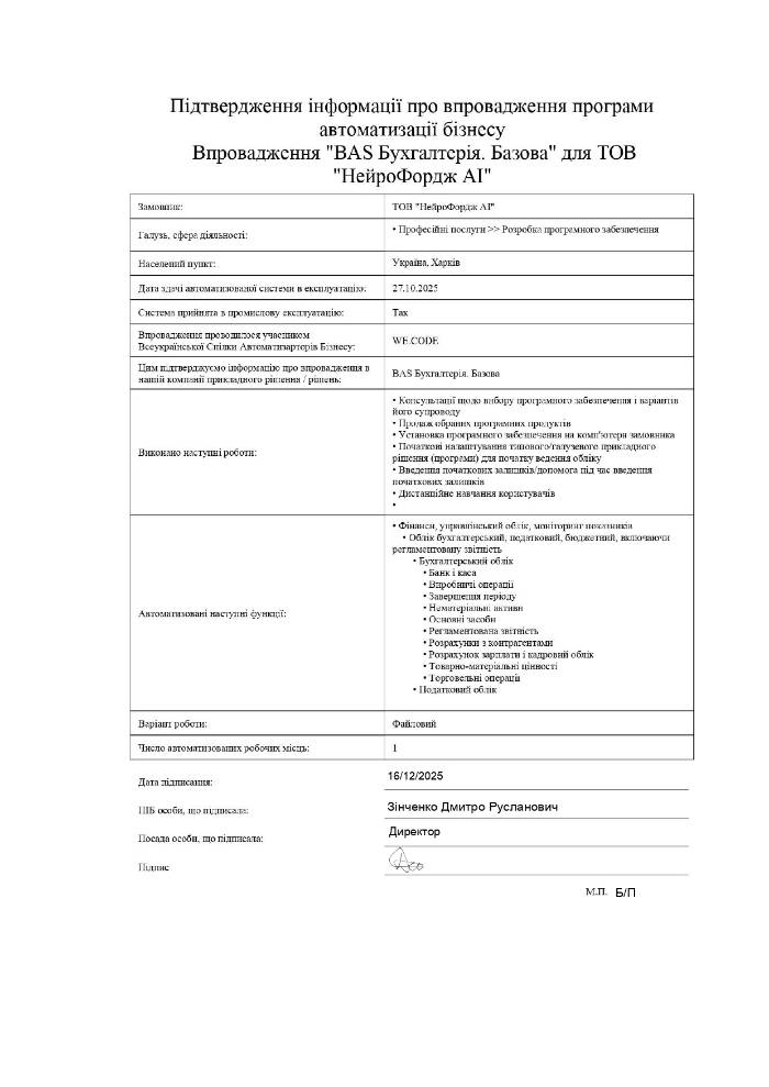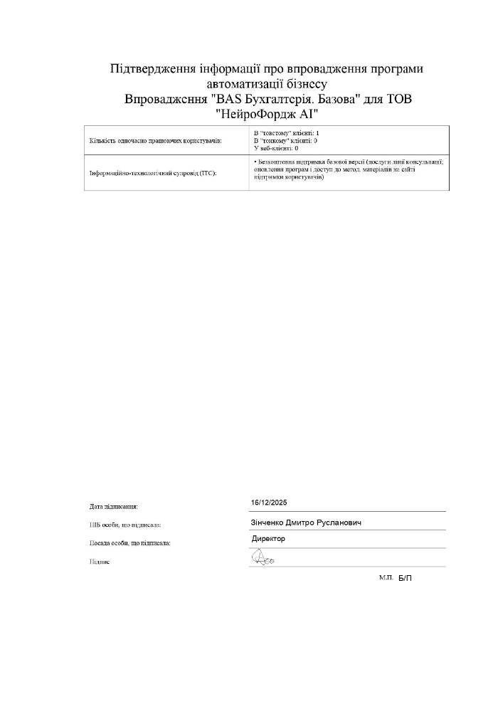 Впровадження "BAS Бухгалтерія. Базова" для ТОВ "НейроФордж АІ"